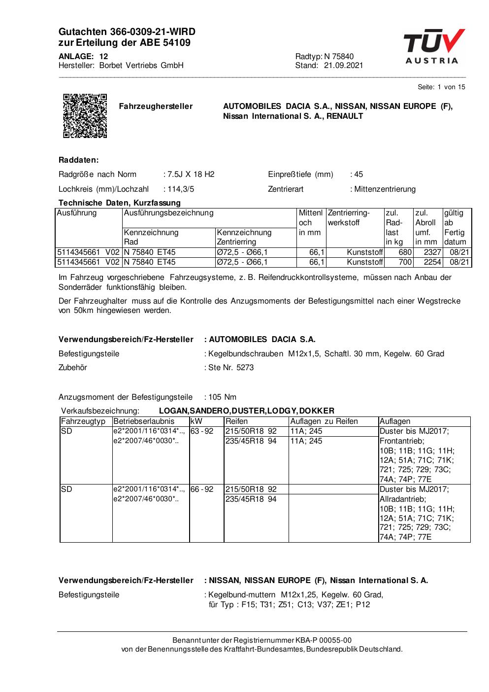 Dieses Gutachten (abe) bezieht sich auf die Alufelge Borbet N 75840 in der Ausführung 7.5Jx18 ET 0, Mittenloch 0 mm (KBA 54109). Im PDF findest du typischerweise zulässige Reifengrößen, Auflagen/Anbauhinweise und – je nach Dokument – Hinweise zur Eintragung.