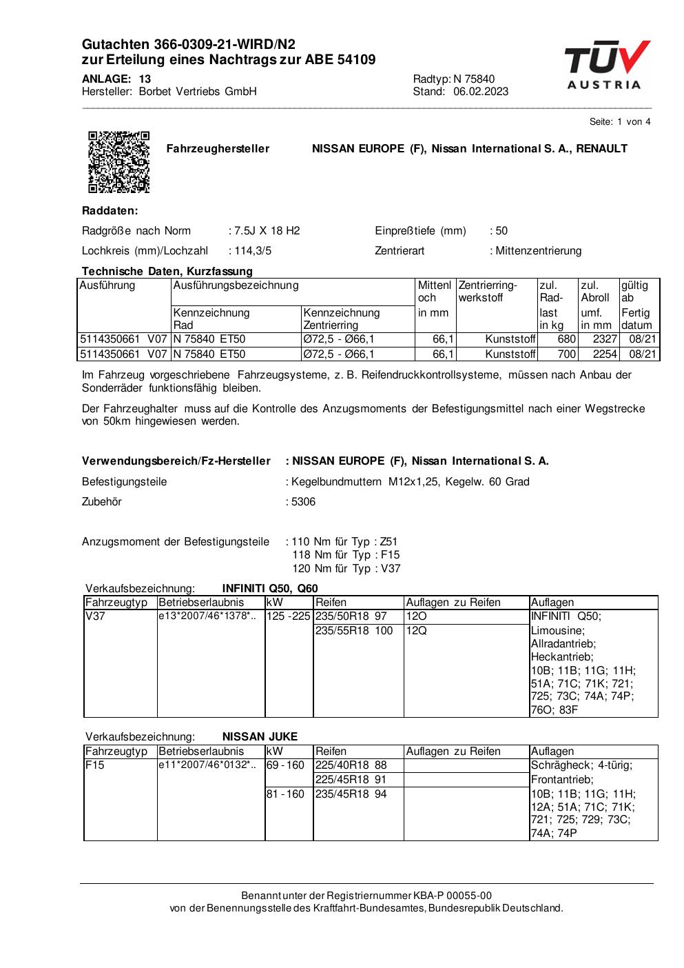 Dieses Gutachten (abe) bezieht sich auf die Alufelge Borbet N 75840 in der Ausführung 7.5Jx18 ET 0, Mittenloch 0 mm (KBA 54109). Im PDF findest du typischerweise zulässige Reifengrößen, Auflagen/Anbauhinweise und – je nach Dokument – Hinweise zur Eintragung.