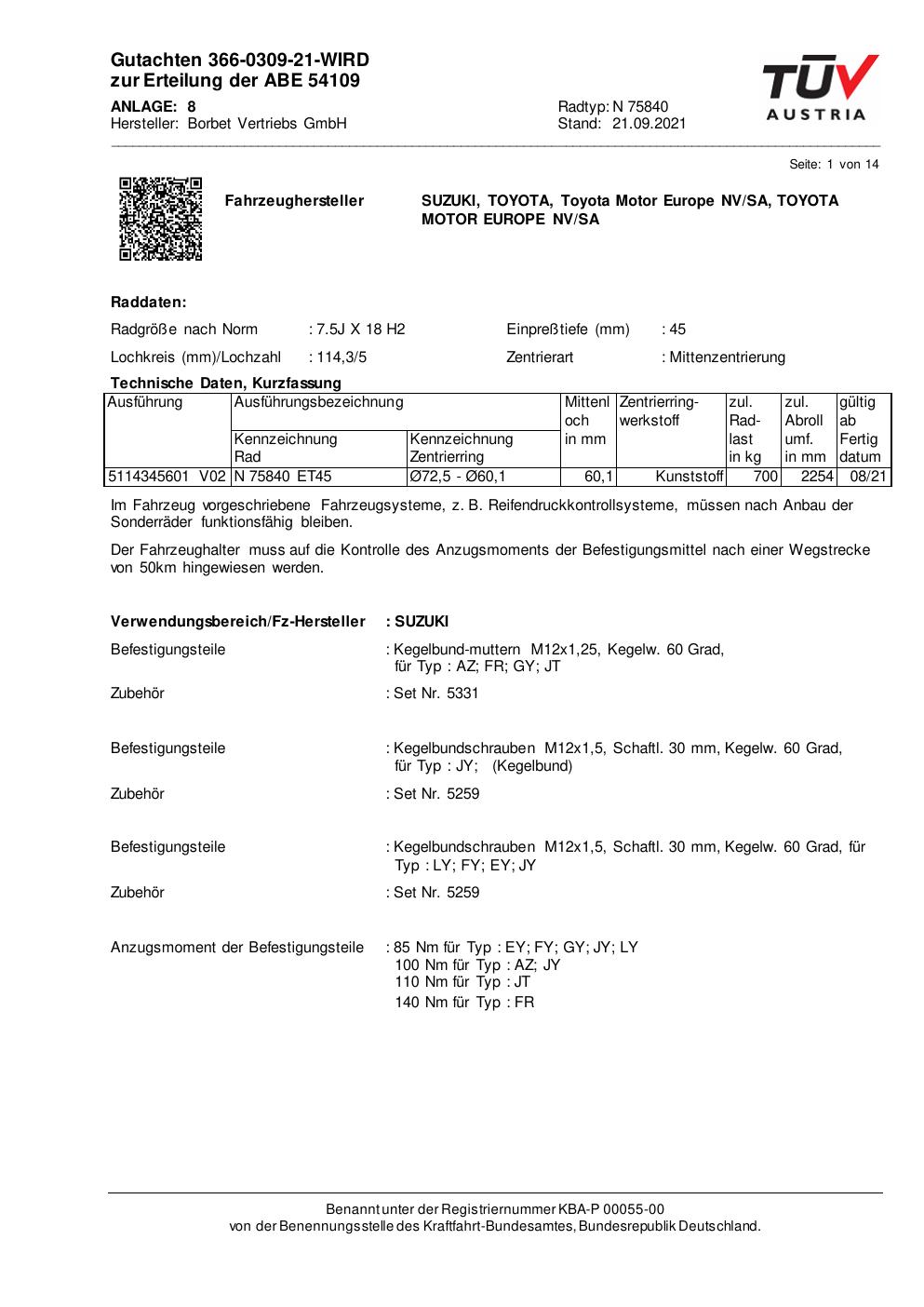 Dieses Gutachten (abe) bezieht sich auf die Alufelge Borbet N 75840 in der Ausführung 7.5Jx18 ET 0, Mittenloch 0 mm (KBA 54109). Im PDF findest du typischerweise zulässige Reifengrößen, Auflagen/Anbauhinweise und – je nach Dokument – Hinweise zur Eintragung.
