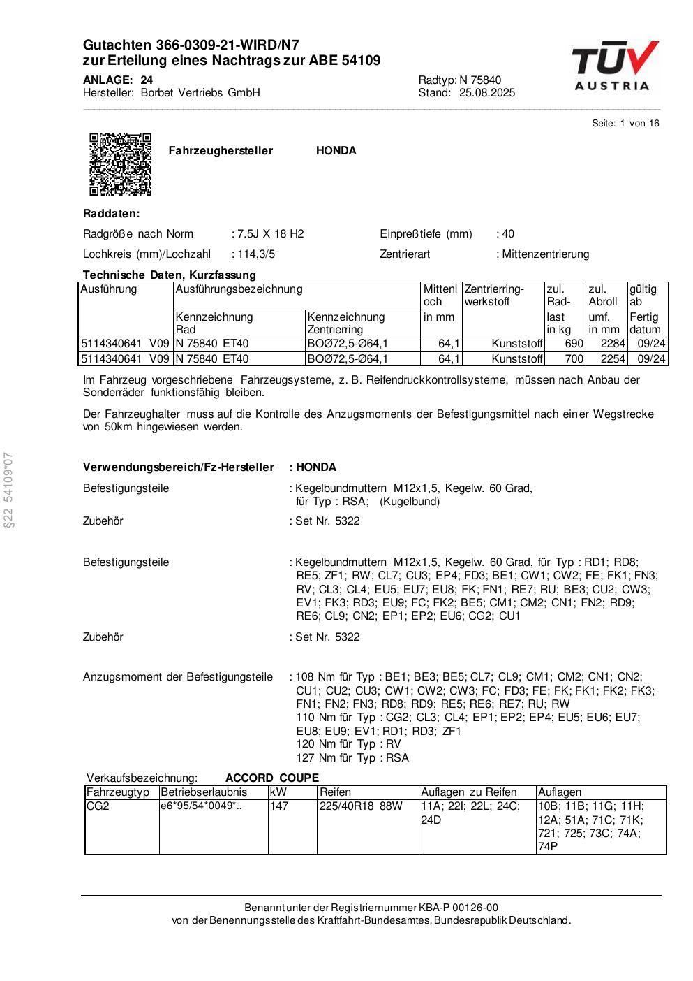 Dieses Gutachten (abe) bezieht sich auf die Alufelge Borbet N 75840 in der Ausführung 7.5Jx18 ET 0, Mittenloch 0 mm (KBA 54109). Im PDF findest du typischerweise zulässige Reifengrößen, Auflagen/Anbauhinweise und – je nach Dokument – Hinweise zur Eintragung.