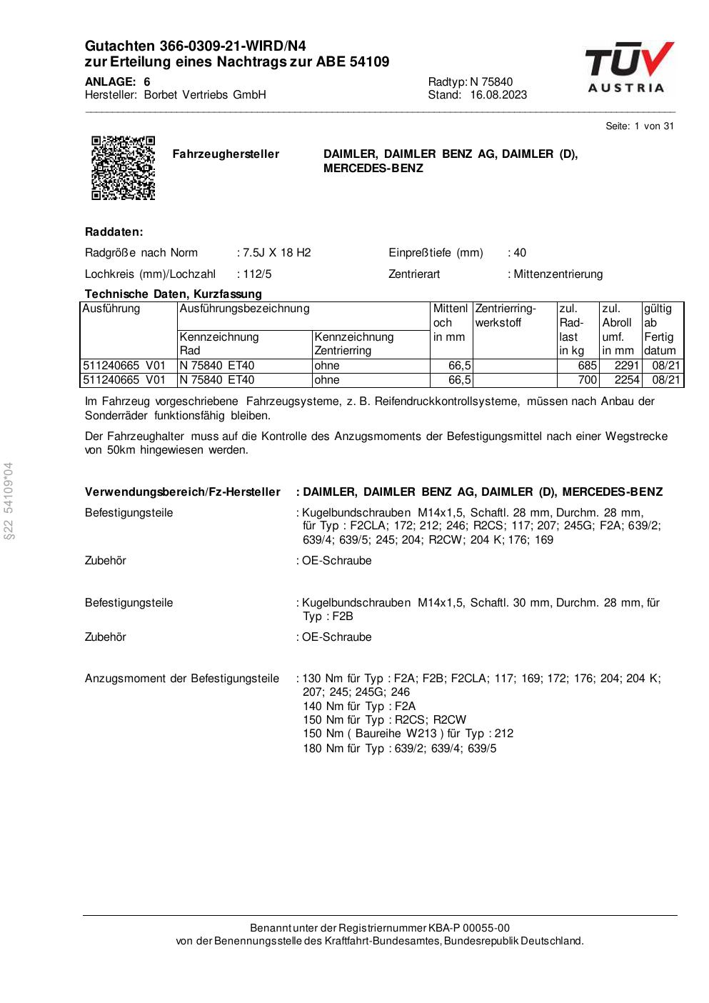 Dieses Gutachten (abe) bezieht sich auf die Alufelge Borbet N 75840 in der Ausführung 7.5Jx18 ET 0, Mittenloch 0 mm (KBA 54109). Im PDF findest du typischerweise zulässige Reifengrößen, Auflagen/Anbauhinweise und – je nach Dokument – Hinweise zur Eintragung.