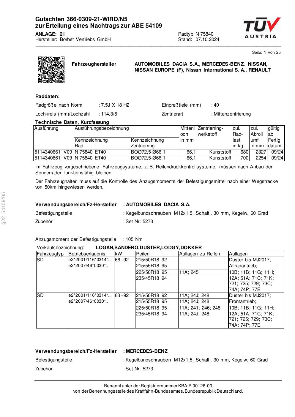 Dieses Gutachten (abe) bezieht sich auf die Alufelge Borbet N 75840 in der Ausführung 7.5Jx18 ET 0, Mittenloch 0 mm (KBA 54109). Im PDF findest du typischerweise zulässige Reifengrößen, Auflagen/Anbauhinweise und – je nach Dokument – Hinweise zur Eintragung.