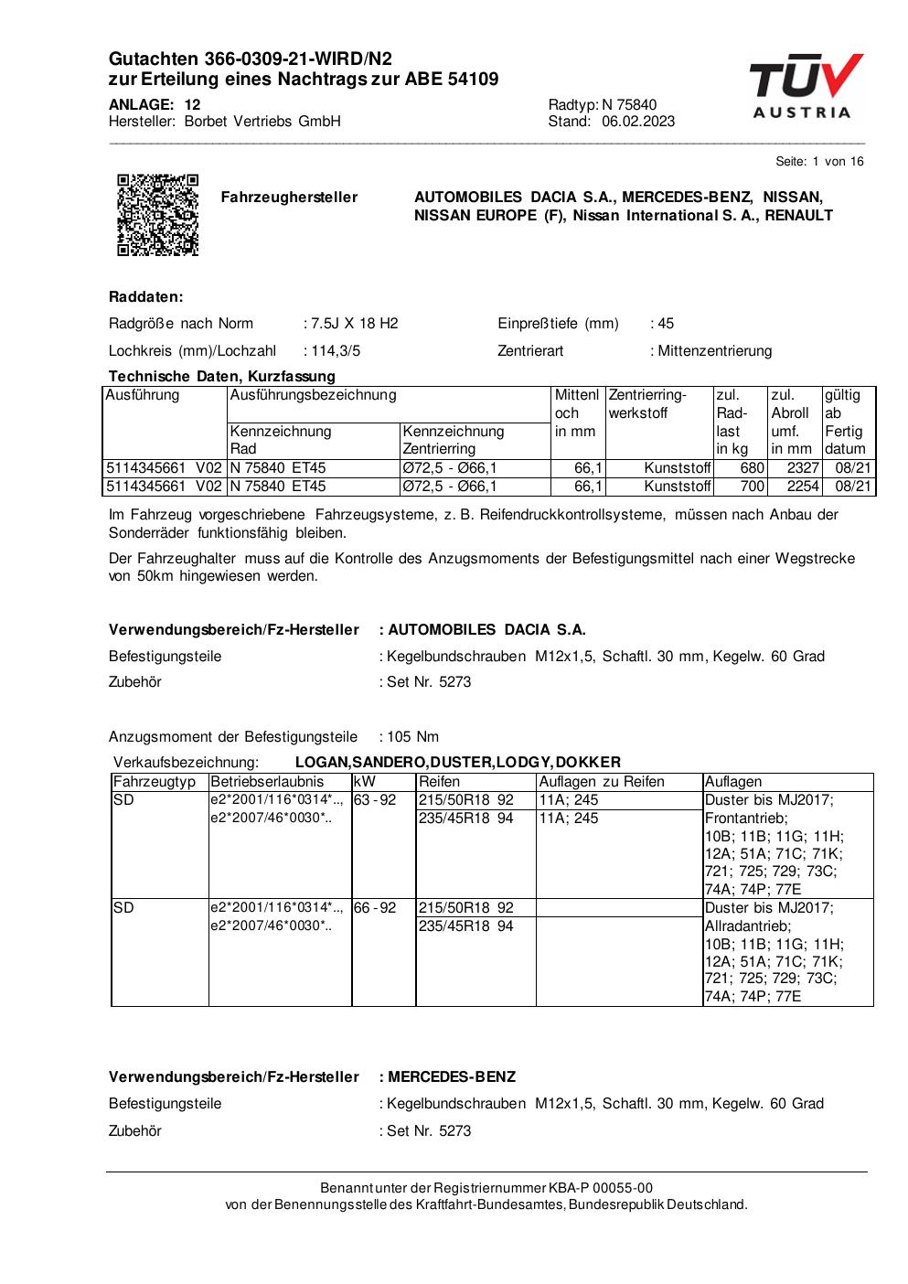Dieses Gutachten (abe) bezieht sich auf die Alufelge Borbet N 75840 in der Ausführung 7.5Jx18 ET 0, Mittenloch 0 mm (KBA 54109). Im PDF findest du typischerweise zulässige Reifengrößen, Auflagen/Anbauhinweise und – je nach Dokument – Hinweise zur Eintragung.