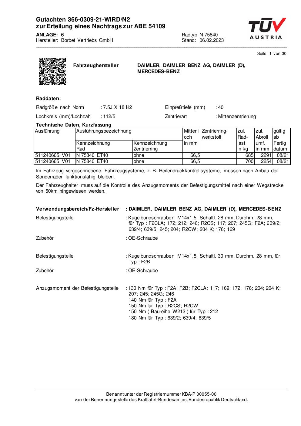 Dieses Gutachten (abe) bezieht sich auf die Alufelge Borbet N 75840 in der Ausführung 7.5Jx18 ET 0, Mittenloch 0 mm (KBA 54109). Im PDF findest du typischerweise zulässige Reifengrößen, Auflagen/Anbauhinweise und – je nach Dokument – Hinweise zur Eintragung.