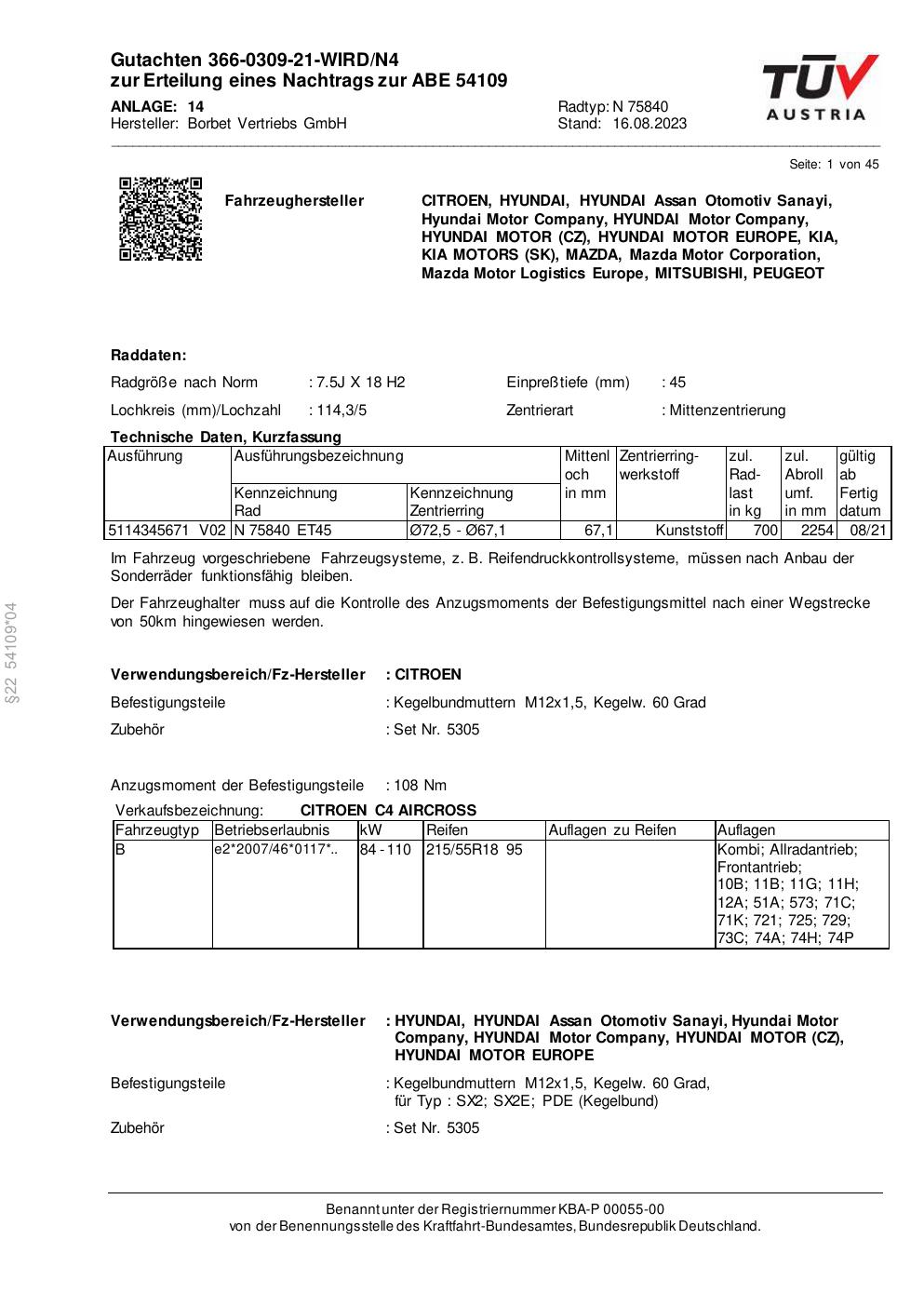 Dieses Gutachten (abe) bezieht sich auf die Alufelge Borbet N 75840 in der Ausführung 7.5Jx18 ET 0, Mittenloch 0 mm (KBA 54109). Im PDF findest du typischerweise zulässige Reifengrößen, Auflagen/Anbauhinweise und – je nach Dokument – Hinweise zur Eintragung.