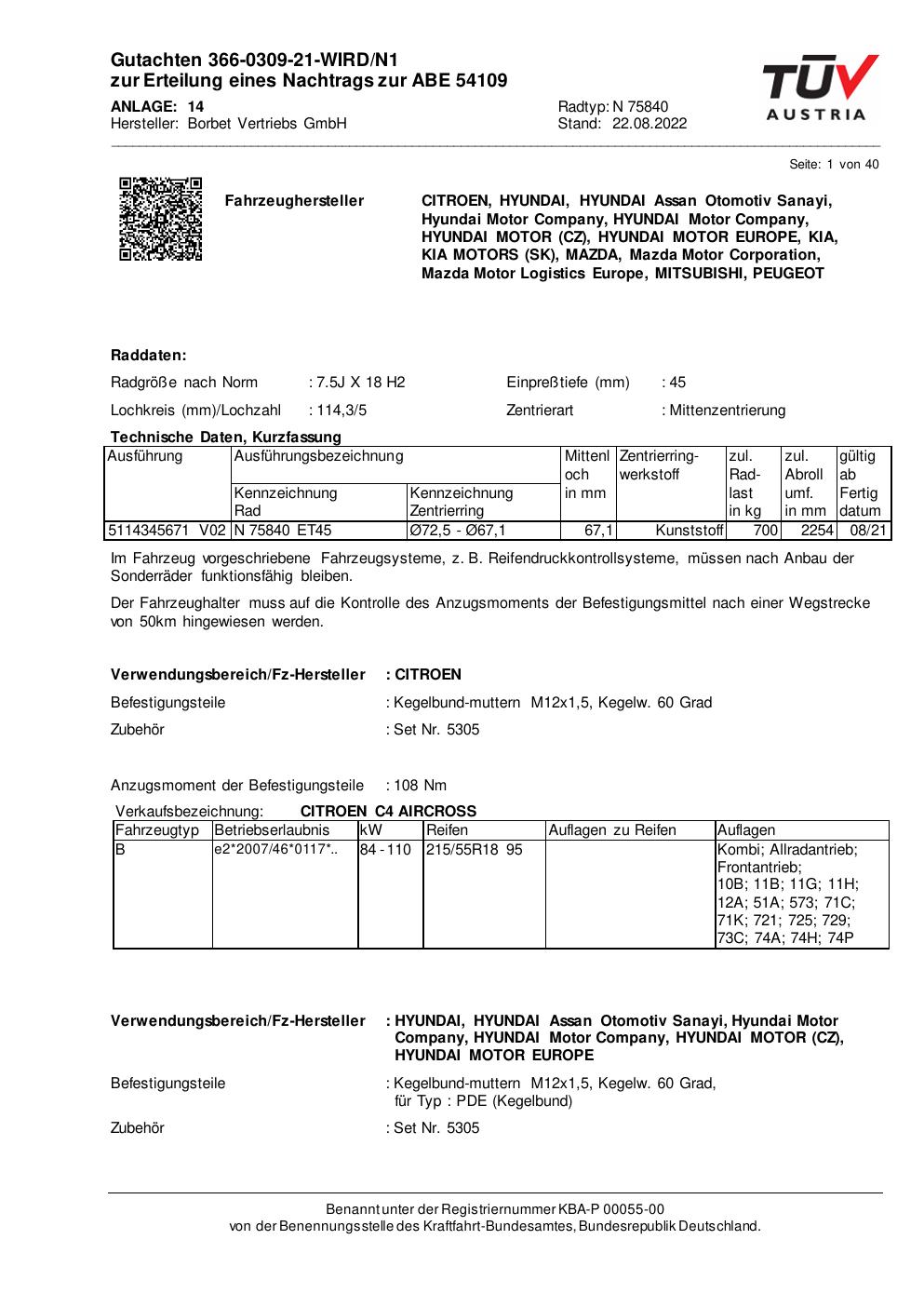 Dieses Gutachten (abe) bezieht sich auf die Alufelge Borbet N 75840 in der Ausführung 7.5Jx18 ET 0, Mittenloch 0 mm (KBA 54109). Im PDF findest du typischerweise zulässige Reifengrößen, Auflagen/Anbauhinweise und – je nach Dokument – Hinweise zur Eintragung.