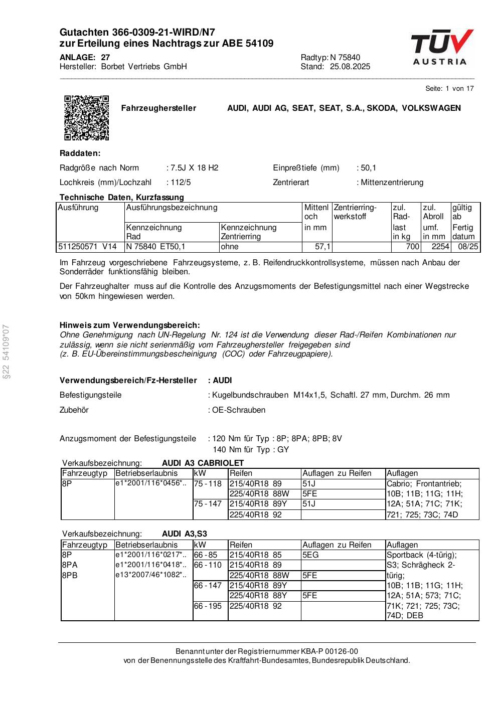 Dieses Gutachten (abe) bezieht sich auf die Alufelge Borbet N 75840 in der Ausführung 7.5Jx18 ET 0, Mittenloch 0 mm (KBA 54109). Im PDF findest du typischerweise zulässige Reifengrößen, Auflagen/Anbauhinweise und – je nach Dokument – Hinweise zur Eintragung.