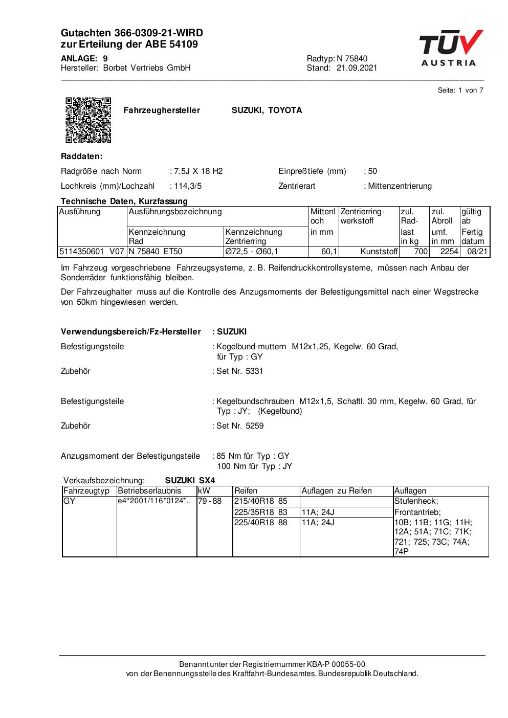 Dieses Gutachten (abe) bezieht sich auf die Alufelge Borbet N 75840 in der Ausführung 7.5Jx18 ET 0, Mittenloch 0 mm (KBA 54109). Im PDF findest du typischerweise zulässige Reifengrößen, Auflagen/Anbauhinweise und – je nach Dokument – Hinweise zur Eintragung.