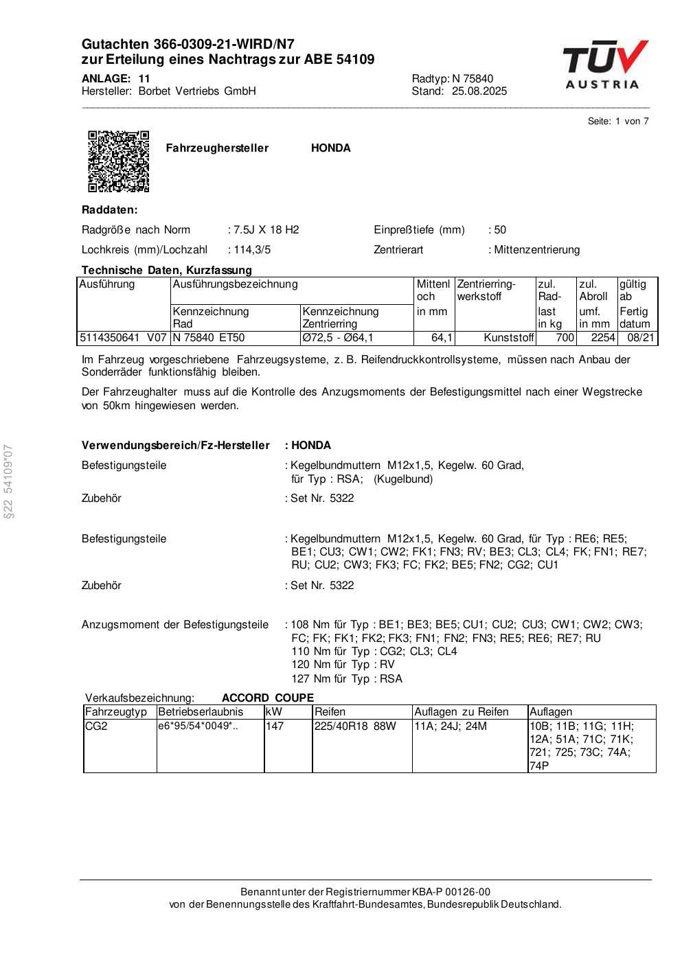 Dieses Gutachten (abe) bezieht sich auf die Alufelge Borbet N 75840 in der Ausführung 7.5Jx18 ET 0, Mittenloch 0 mm (KBA 54109). Im PDF findest du typischerweise zulässige Reifengrößen, Auflagen/Anbauhinweise und – je nach Dokument – Hinweise zur Eintragung.