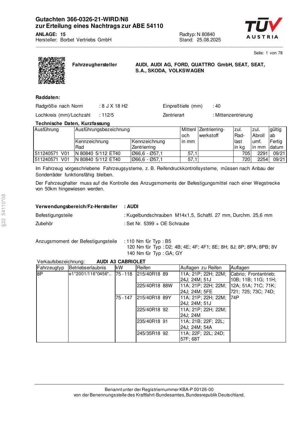 Dieses Gutachten (abe) bezieht sich auf die Alufelge Borbet N 80840 in der Ausführung 8Jx18 ET 0, Mittenloch 0 mm (KBA 54110). Im PDF findest du typischerweise zulässige Reifengrößen, Auflagen/Anbauhinweise und – je nach Dokument – Hinweise zur Eintragung.