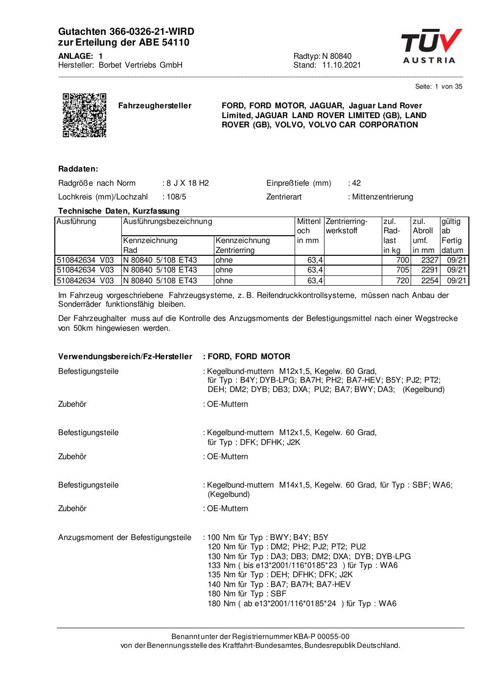 Dieses Gutachten (abe) bezieht sich auf die Alufelge Borbet N 80840 in der Ausführung 8Jx18 ET 0, Mittenloch 0 mm (KBA 54110). Im PDF findest du typischerweise zulässige Reifengrößen, Auflagen/Anbauhinweise und – je nach Dokument – Hinweise zur Eintragung.