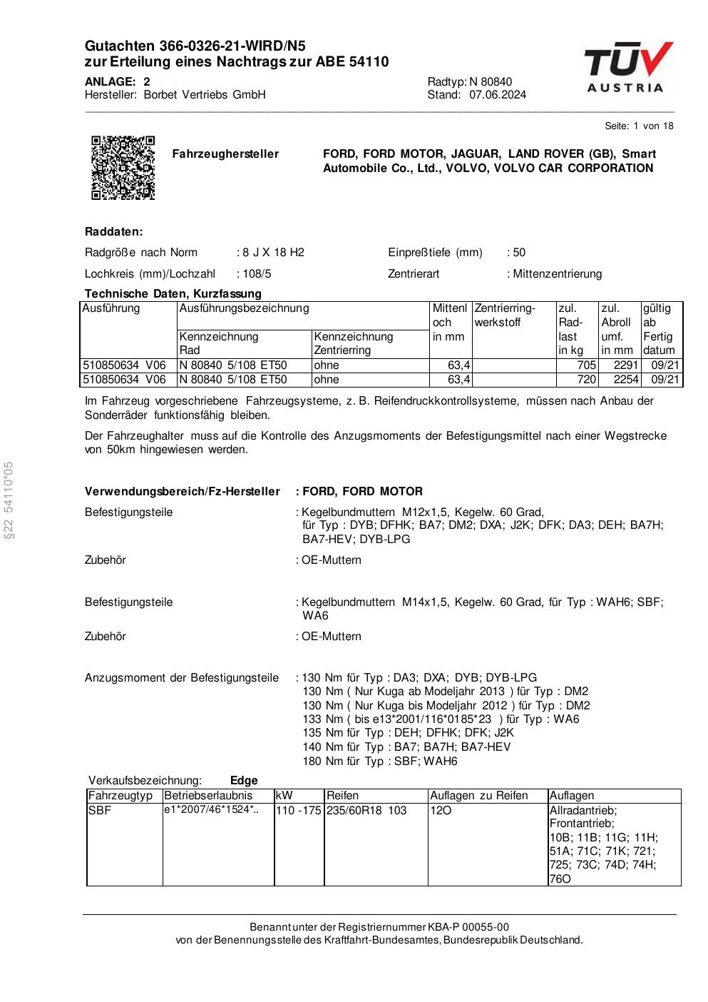 Dieses Gutachten (abe) bezieht sich auf die Alufelge Borbet N 80840 in der Ausführung 8Jx18 ET 0, Mittenloch 0 mm (KBA 54110). Im PDF findest du typischerweise zulässige Reifengrößen, Auflagen/Anbauhinweise und – je nach Dokument – Hinweise zur Eintragung.