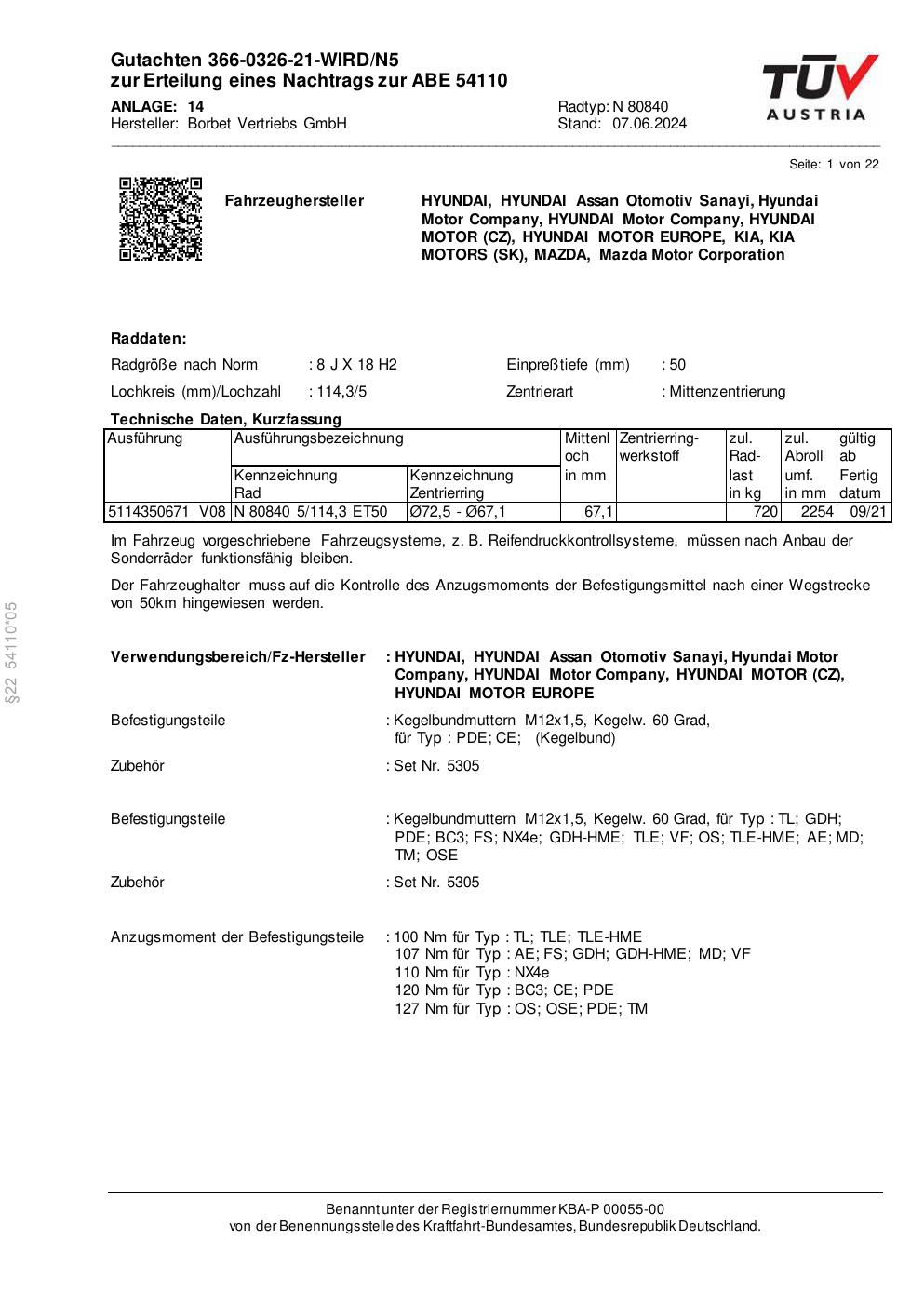 Dieses Gutachten (abe) bezieht sich auf die Alufelge Borbet N 80840 in der Ausführung 8Jx18 ET 0, Mittenloch 0 mm (KBA 54110). Im PDF findest du typischerweise zulässige Reifengrößen, Auflagen/Anbauhinweise und – je nach Dokument – Hinweise zur Eintragung.