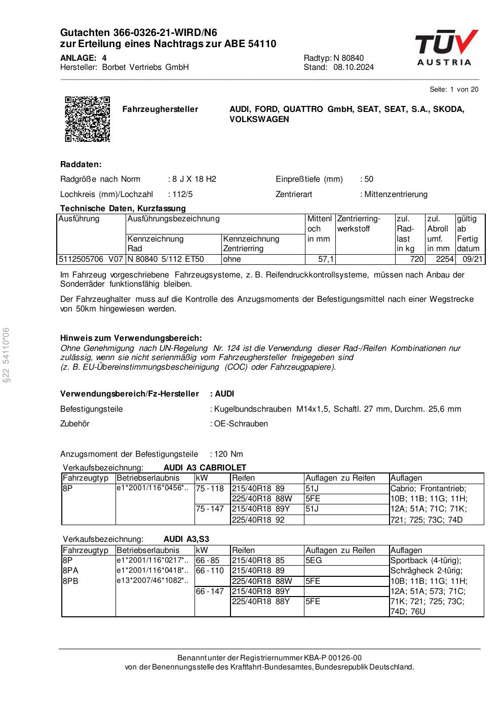 Dieses Gutachten (abe) bezieht sich auf die Alufelge Borbet N 80840 in der Ausführung 8Jx18 ET 0, Mittenloch 0 mm (KBA 54110). Im PDF findest du typischerweise zulässige Reifengrößen, Auflagen/Anbauhinweise und – je nach Dokument – Hinweise zur Eintragung.