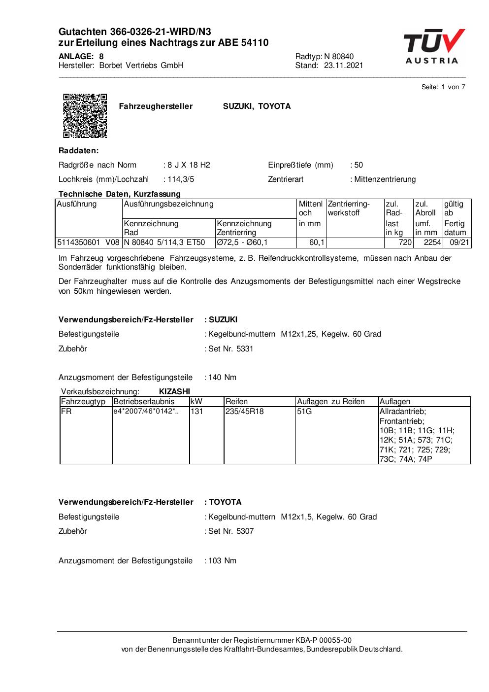 Dieses Gutachten (abe) bezieht sich auf die Alufelge Borbet N 80840 in der Ausführung 8Jx18 ET 0, Mittenloch 0 mm (KBA 54110). Im PDF findest du typischerweise zulässige Reifengrößen, Auflagen/Anbauhinweise und – je nach Dokument – Hinweise zur Eintragung.