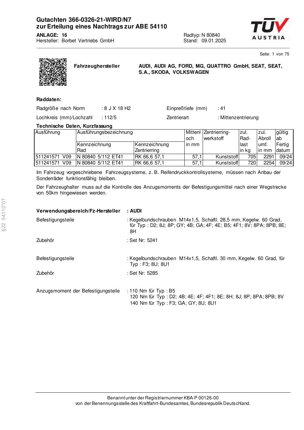 Dieses Gutachten (abe) bezieht sich auf die Alufelge Borbet N 80840 in der Ausführung 8Jx18 ET 0, Mittenloch 0 mm (KBA 54110). Im PDF findest du typischerweise zulässige Reifengrößen, Auflagen/Anbauhinweise und – je nach Dokument – Hinweise zur Eintragung.