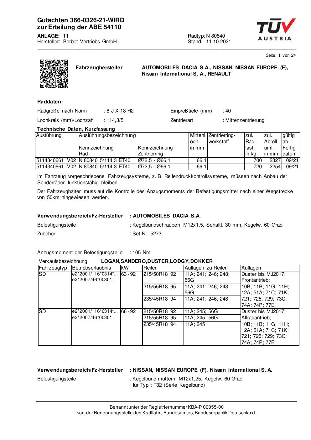 Dieses Gutachten (abe) bezieht sich auf die Alufelge Borbet N 80840 in der Ausführung 8Jx18 ET 0, Mittenloch 0 mm (KBA 54110). Im PDF findest du typischerweise zulässige Reifengrößen, Auflagen/Anbauhinweise und – je nach Dokument – Hinweise zur Eintragung.