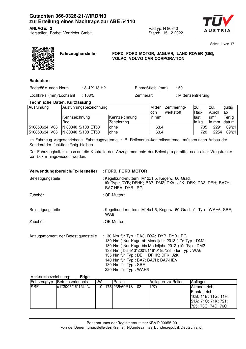 Dieses Gutachten (abe) bezieht sich auf die Alufelge Borbet N 80840 in der Ausführung 8Jx18 ET 0, Mittenloch 0 mm (KBA 54110). Im PDF findest du typischerweise zulässige Reifengrößen, Auflagen/Anbauhinweise und – je nach Dokument – Hinweise zur Eintragung.