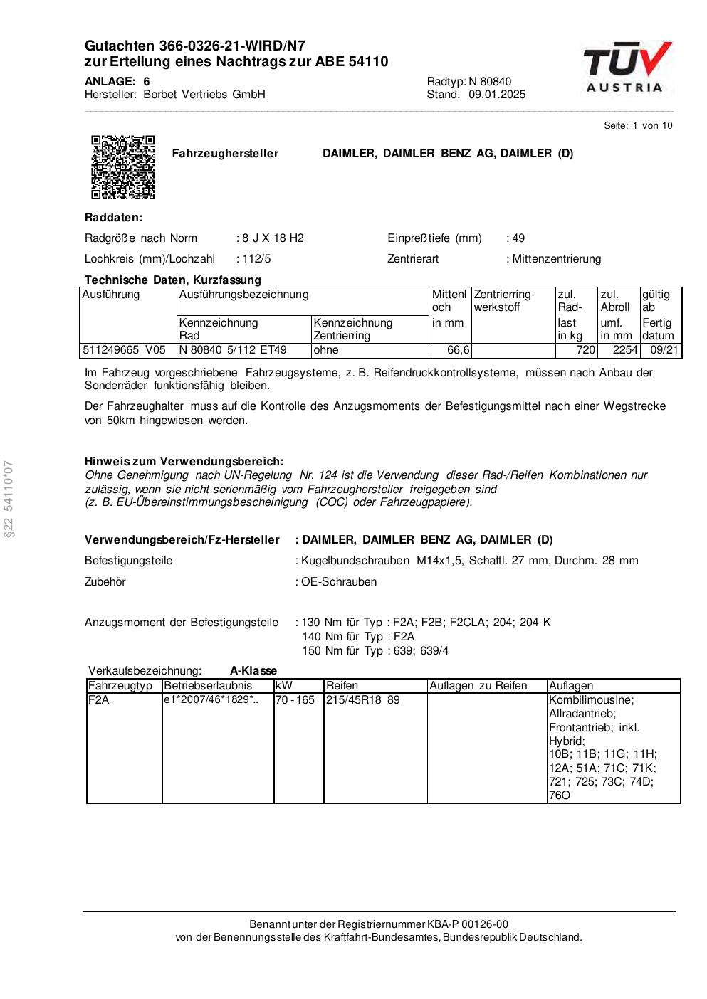Dieses Gutachten (abe) bezieht sich auf die Alufelge Borbet N 80840 in der Ausführung 8Jx18 ET 0, Mittenloch 0 mm (KBA 54110). Im PDF findest du typischerweise zulässige Reifengrößen, Auflagen/Anbauhinweise und – je nach Dokument – Hinweise zur Eintragung.