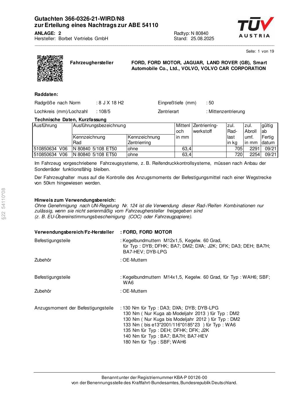 Dieses Gutachten (abe) bezieht sich auf die Alufelge Borbet N 80840 in der Ausführung 8Jx18 ET 0, Mittenloch 0 mm (KBA 54110). Im PDF findest du typischerweise zulässige Reifengrößen, Auflagen/Anbauhinweise und – je nach Dokument – Hinweise zur Eintragung.