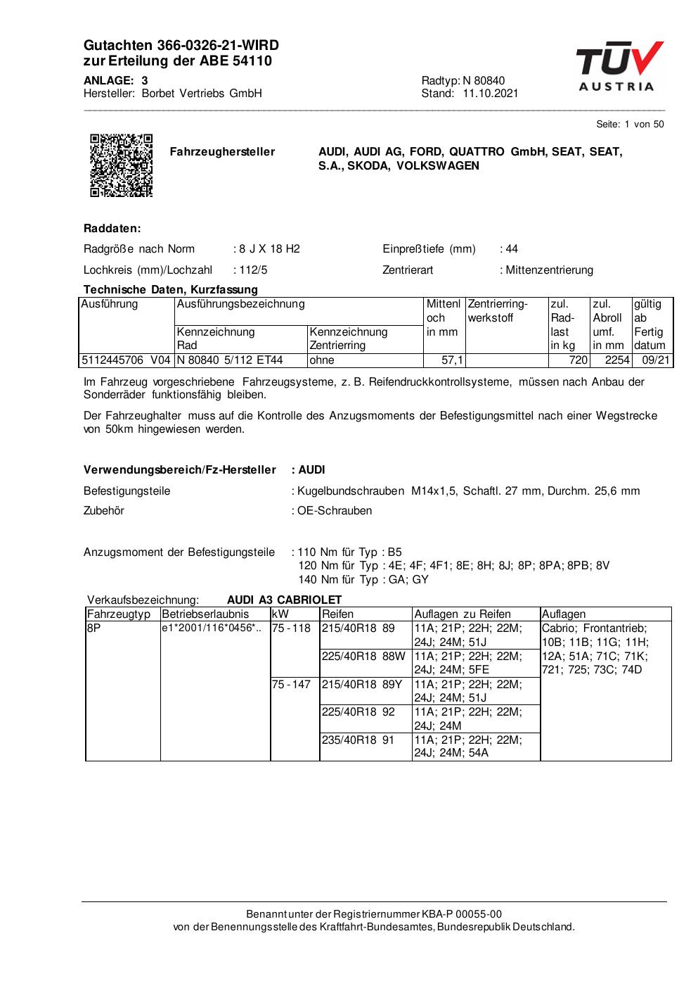 Dieses Gutachten (abe) bezieht sich auf die Alufelge Borbet N 80840 in der Ausführung 8Jx18 ET 0, Mittenloch 0 mm (KBA 54110). Im PDF findest du typischerweise zulässige Reifengrößen, Auflagen/Anbauhinweise und – je nach Dokument – Hinweise zur Eintragung.