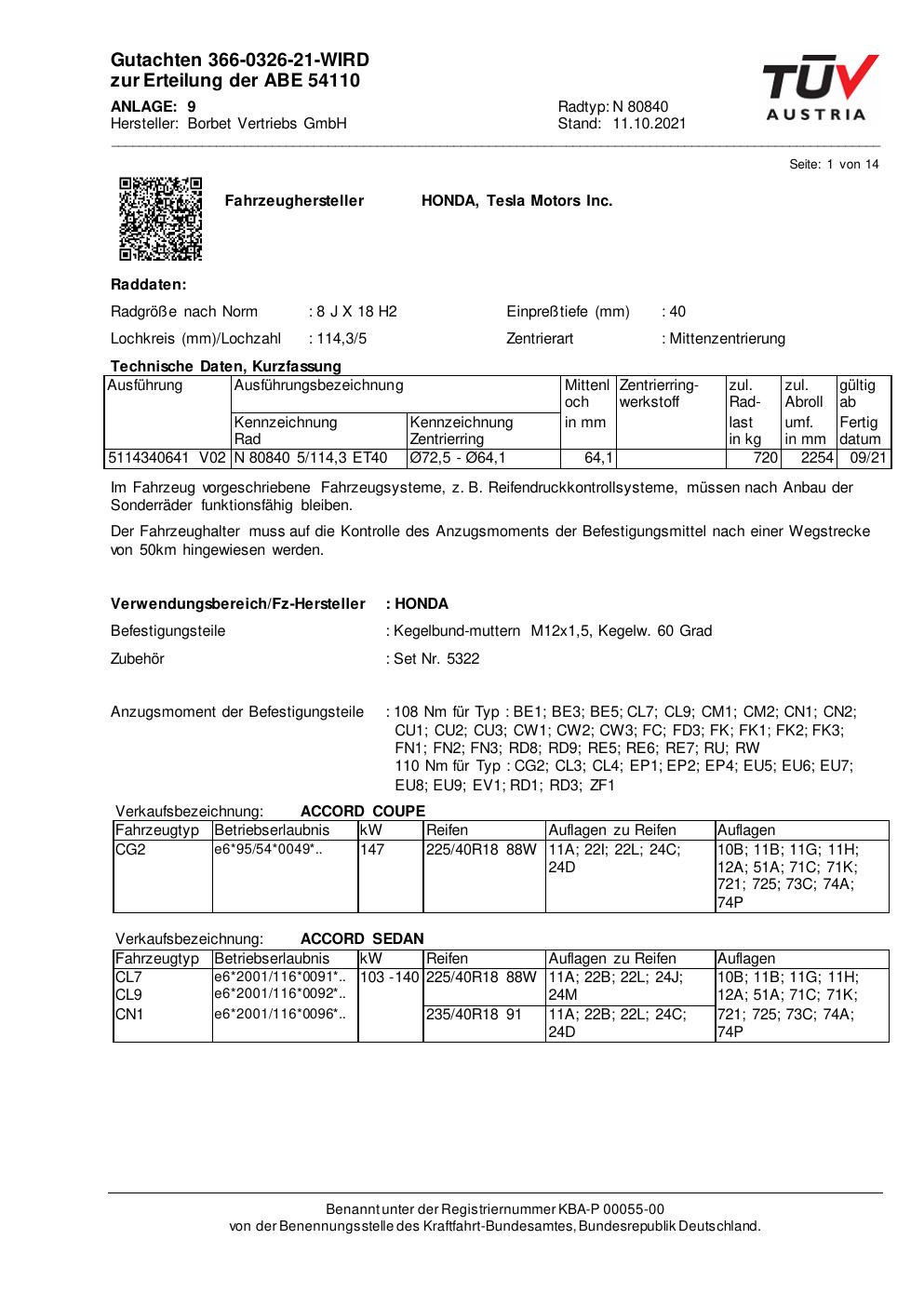 Dieses Gutachten (abe) bezieht sich auf die Alufelge Borbet N 80840 in der Ausführung 8Jx18 ET 0, Mittenloch 0 mm (KBA 54110). Im PDF findest du typischerweise zulässige Reifengrößen, Auflagen/Anbauhinweise und – je nach Dokument – Hinweise zur Eintragung.