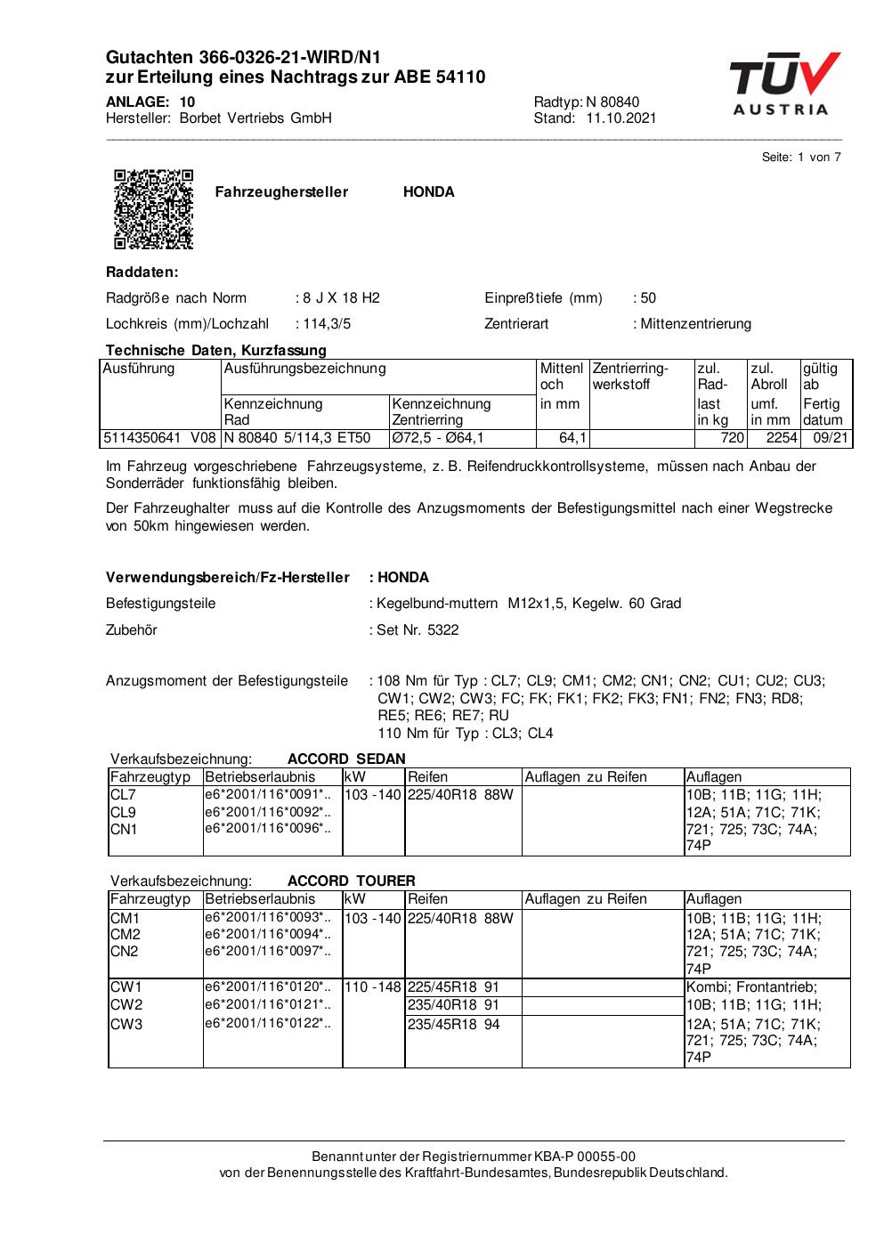 Dieses Gutachten (abe) bezieht sich auf die Alufelge Borbet N 80840 in der Ausführung 8Jx18 ET 0, Mittenloch 0 mm (KBA 54110). Im PDF findest du typischerweise zulässige Reifengrößen, Auflagen/Anbauhinweise und – je nach Dokument – Hinweise zur Eintragung.