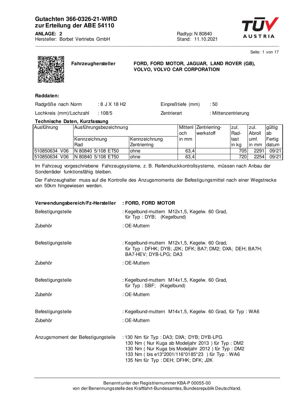 Dieses Gutachten (abe) bezieht sich auf die Alufelge Borbet N 80840 in der Ausführung 8Jx18 ET 0, Mittenloch 0 mm (KBA 54110). Im PDF findest du typischerweise zulässige Reifengrößen, Auflagen/Anbauhinweise und – je nach Dokument – Hinweise zur Eintragung.
