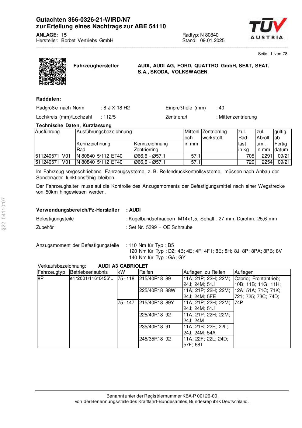 Dieses Gutachten (abe) bezieht sich auf die Alufelge Borbet N 80840 in der Ausführung 8Jx18 ET 0, Mittenloch 0 mm (KBA 54110). Im PDF findest du typischerweise zulässige Reifengrößen, Auflagen/Anbauhinweise und – je nach Dokument – Hinweise zur Eintragung.