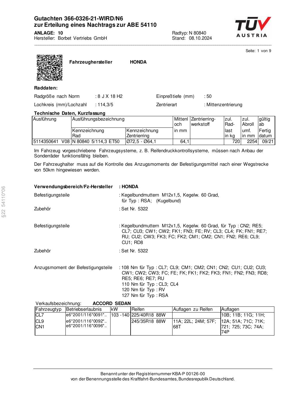 Dieses Gutachten (abe) bezieht sich auf die Alufelge Borbet N 80840 in der Ausführung 8Jx18 ET 0, Mittenloch 0 mm (KBA 54110). Im PDF findest du typischerweise zulässige Reifengrößen, Auflagen/Anbauhinweise und – je nach Dokument – Hinweise zur Eintragung.