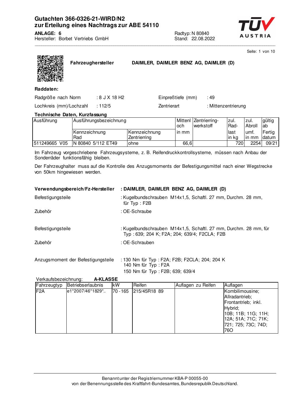 Dieses Gutachten (abe) bezieht sich auf die Alufelge Borbet N 80840 in der Ausführung 8Jx18 ET 0, Mittenloch 0 mm (KBA 54110). Im PDF findest du typischerweise zulässige Reifengrößen, Auflagen/Anbauhinweise und – je nach Dokument – Hinweise zur Eintragung.