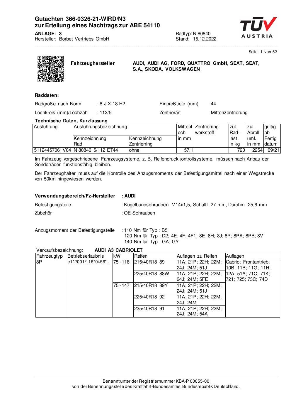 Dieses Gutachten (abe) bezieht sich auf die Alufelge Borbet N 80840 in der Ausführung 8Jx18 ET 0, Mittenloch 0 mm (KBA 54110). Im PDF findest du typischerweise zulässige Reifengrößen, Auflagen/Anbauhinweise und – je nach Dokument – Hinweise zur Eintragung.
