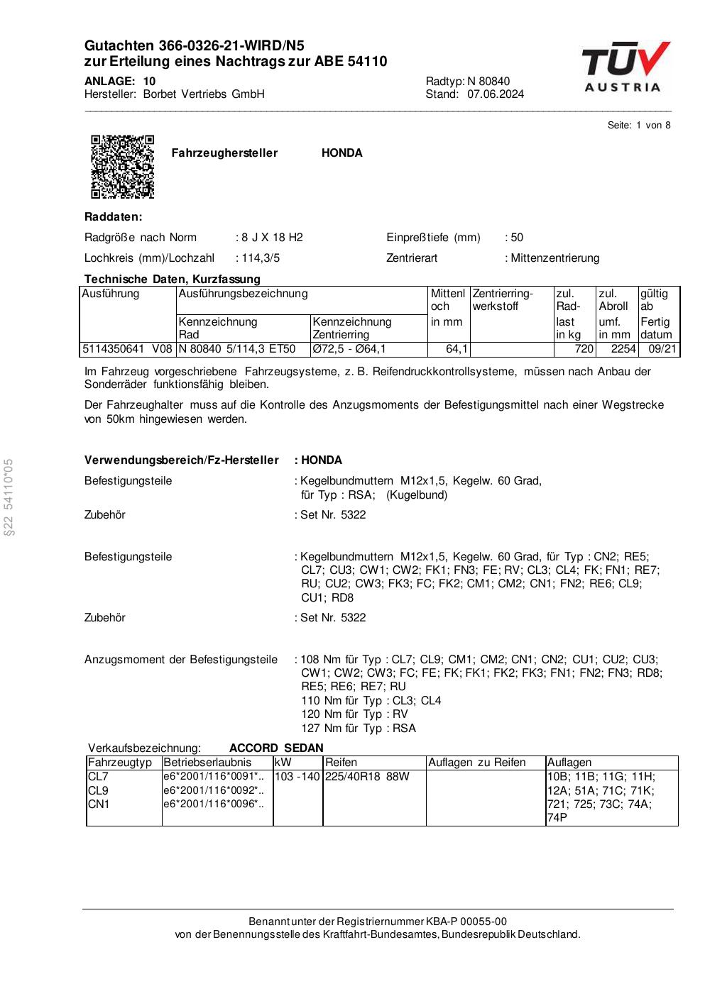 Dieses Gutachten (abe) bezieht sich auf die Alufelge Borbet N 80840 in der Ausführung 8Jx18 ET 0, Mittenloch 0 mm (KBA 54110). Im PDF findest du typischerweise zulässige Reifengrößen, Auflagen/Anbauhinweise und – je nach Dokument – Hinweise zur Eintragung.
