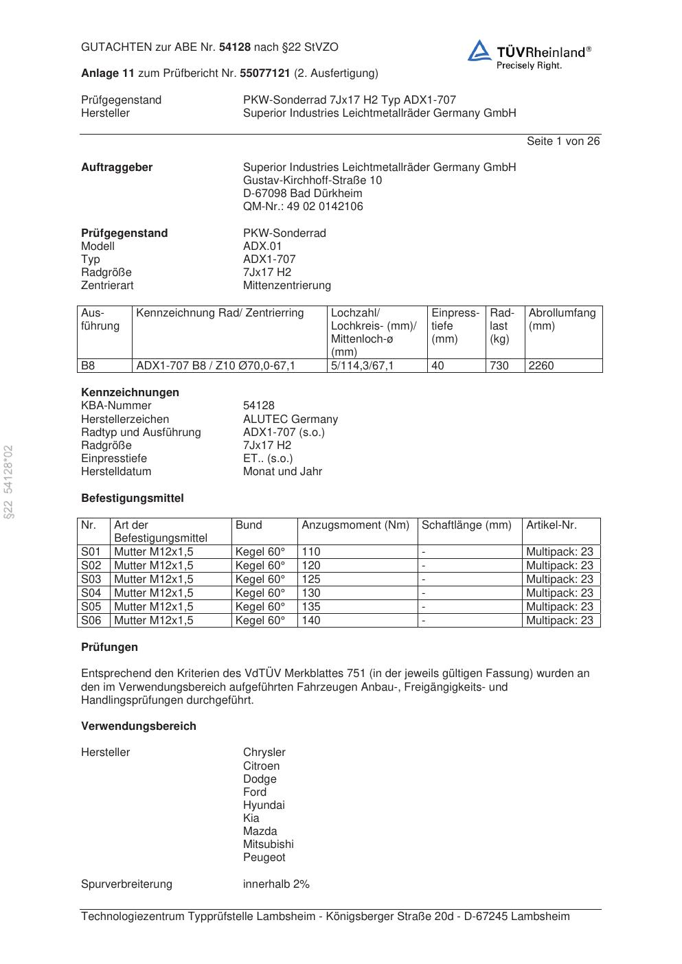 Dieses Gutachten (abe) bezieht sich auf die Alufelge ALUTEC ADX1-707 in der Ausführung 7Jx17 ET 0, Mittenloch 0 mm (KBA 54128). Im PDF findest du typischerweise zulässige Reifengrößen, Auflagen/Anbauhinweise und – je nach Dokument – Hinweise zur Eintragung.