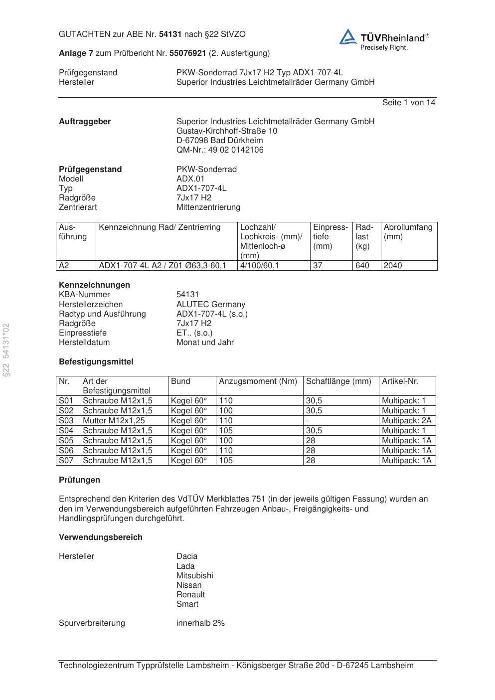 Dieses Gutachten (abe) bezieht sich auf die Alufelge ALUTEC ADX1-707-4L in der Ausführung 7Jx17 ET 0, Mittenloch 0 mm (KBA 54131). Im PDF findest du typischerweise zulässige Reifengrößen, Auflagen/Anbauhinweise und – je nach Dokument – Hinweise zur Eintragung.