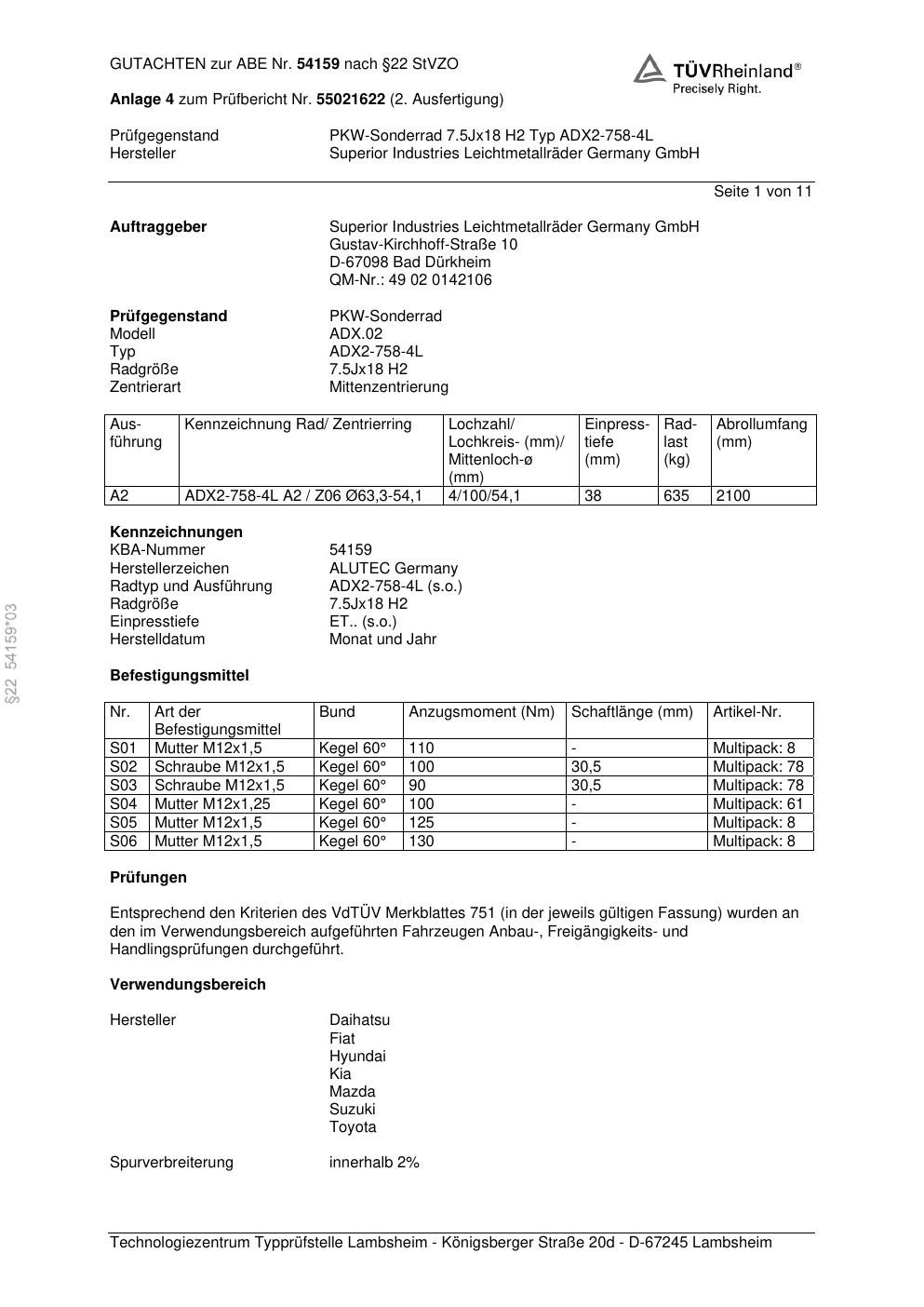 Dieses Gutachten (abe) bezieht sich auf die Alufelge ALUTEC ADX2-758-4L in der Ausführung 7.5Jx18 ET 0, Mittenloch 0 mm (KBA 54159). Im PDF findest du typischerweise zulässige Reifengrößen, Auflagen/Anbauhinweise und – je nach Dokument – Hinweise zur Eintragung.