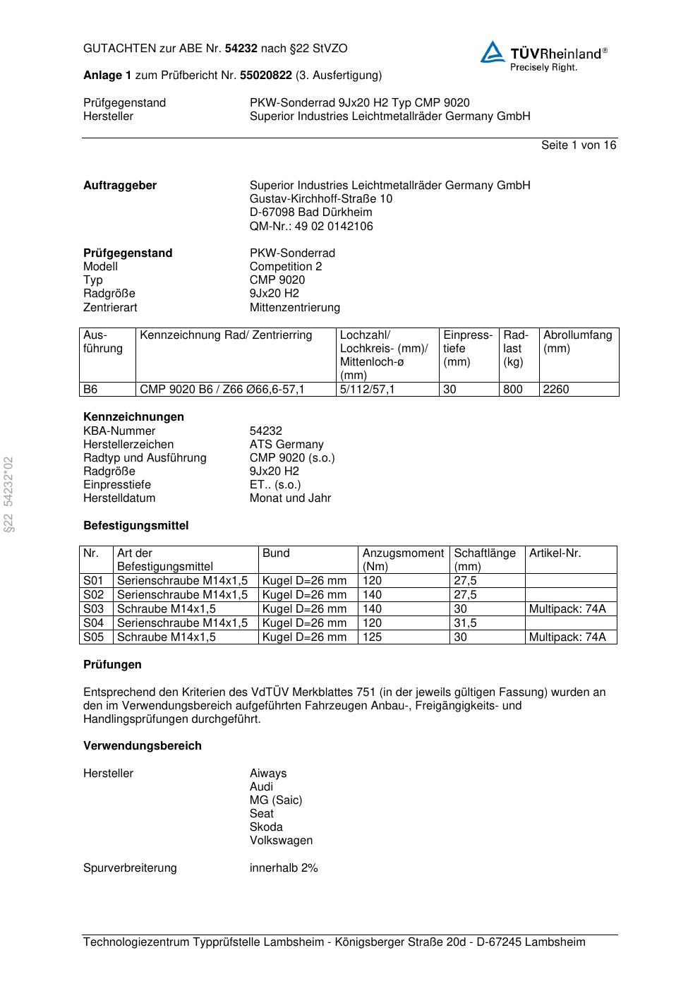 Dieses Gutachten (abe) bezieht sich auf die Alufelge ATS CMP 9020 in der Ausführung 9Jx2 ET 0, Mittenloch 0 mm (KBA 54232). Im PDF findest du typischerweise zulässige Reifengrößen, Auflagen/Anbauhinweise und – je nach Dokument – Hinweise zur Eintragung.