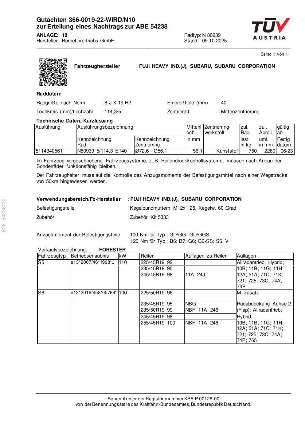 Dieses Gutachten (abe) bezieht sich auf die Alufelge Borbet N 80939 in der Ausführung 8Jx19 ET 0, Mittenloch 0 mm (KBA 54238). Im PDF findest du typischerweise zulässige Reifengrößen, Auflagen/Anbauhinweise und – je nach Dokument – Hinweise zur Eintragung.