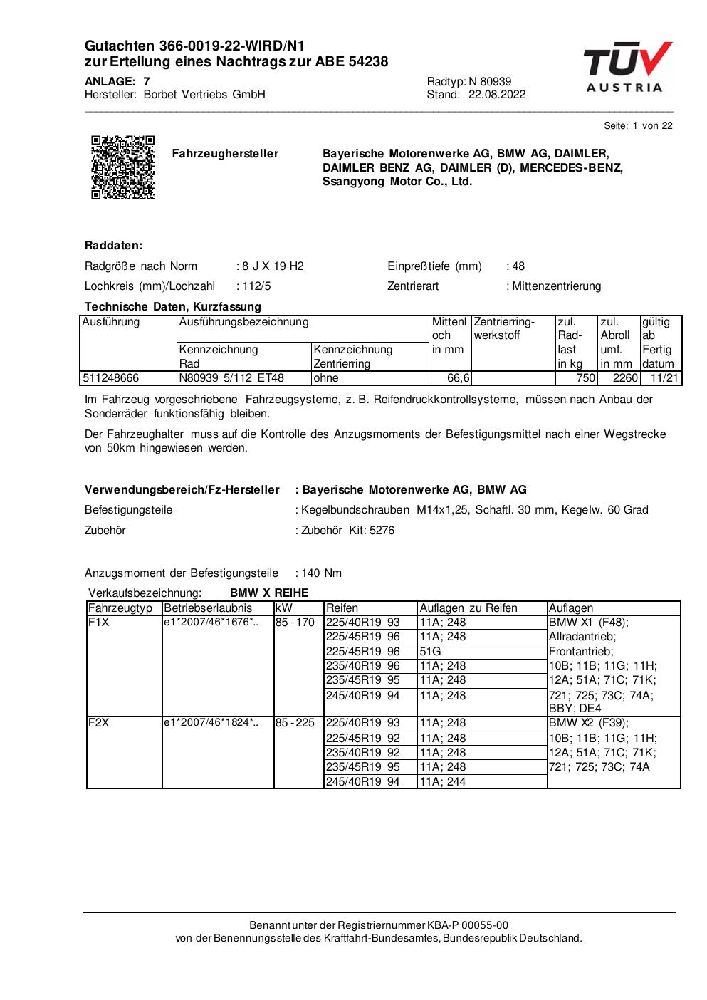 Dieses Gutachten (abe) bezieht sich auf die Alufelge Borbet N 80939 in der Ausführung 8Jx19 ET 0, Mittenloch 0 mm (KBA 54238). Im PDF findest du typischerweise zulässige Reifengrößen, Auflagen/Anbauhinweise und – je nach Dokument – Hinweise zur Eintragung.