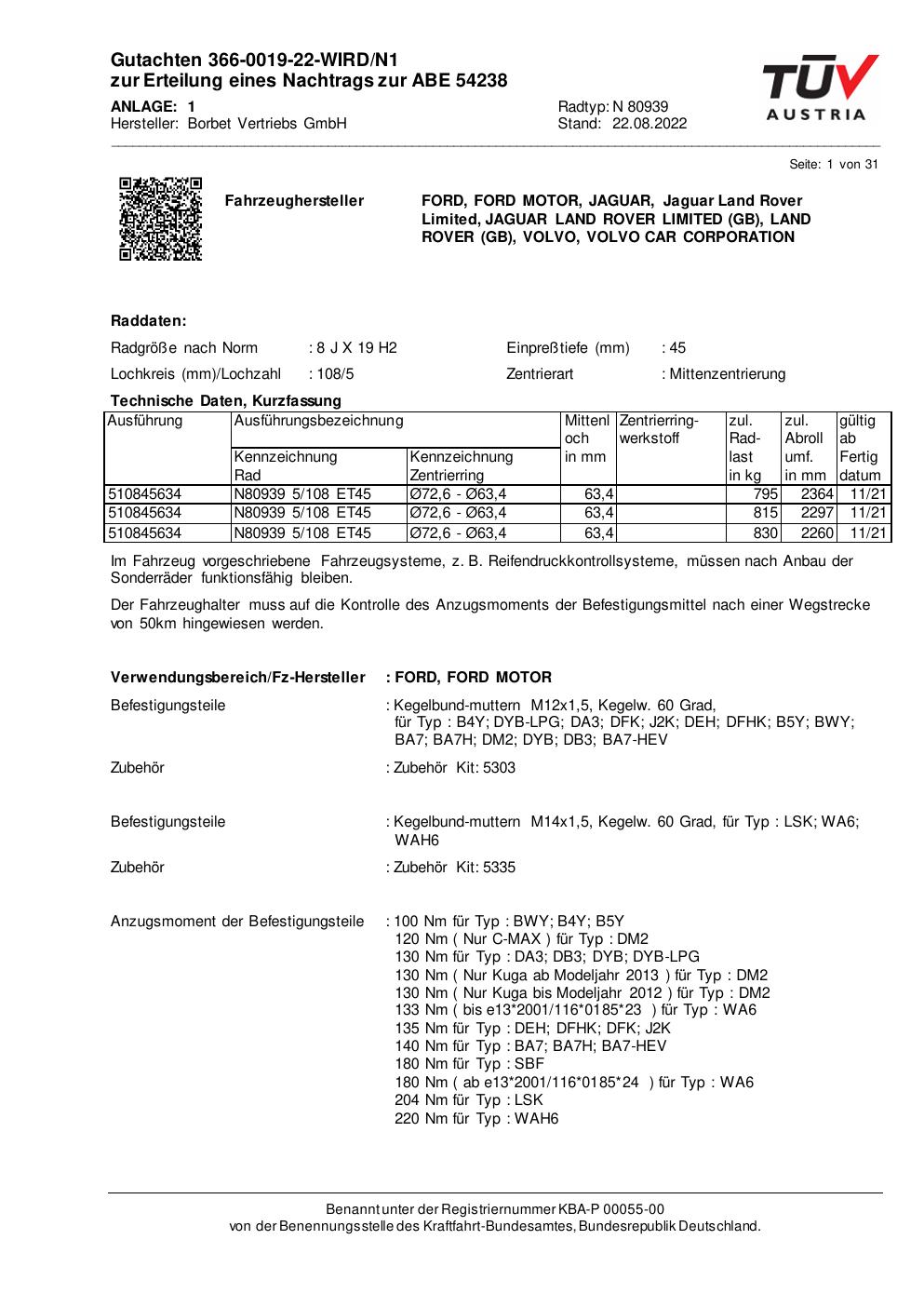 Dieses Gutachten (abe) bezieht sich auf die Alufelge Borbet N 80939 in der Ausführung 8Jx19 ET 0, Mittenloch 0 mm (KBA 54238). Im PDF findest du typischerweise zulässige Reifengrößen, Auflagen/Anbauhinweise und – je nach Dokument – Hinweise zur Eintragung.
