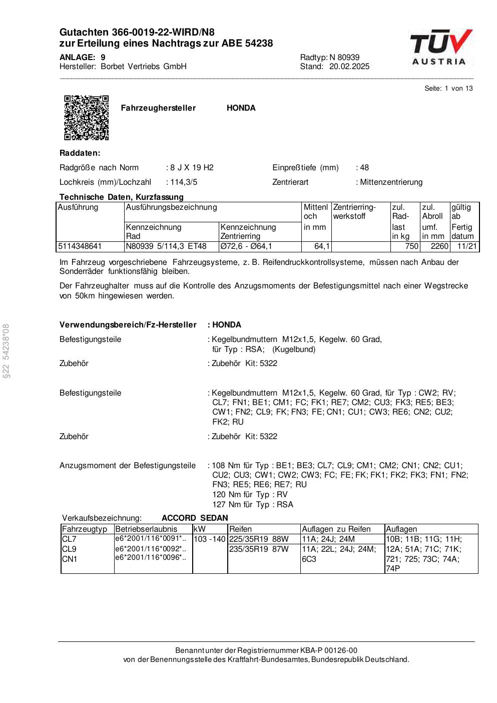 Dieses Gutachten (abe) bezieht sich auf die Alufelge Borbet N 80939 in der Ausführung 8Jx19 ET 0, Mittenloch 0 mm (KBA 54238). Im PDF findest du typischerweise zulässige Reifengrößen, Auflagen/Anbauhinweise und – je nach Dokument – Hinweise zur Eintragung.