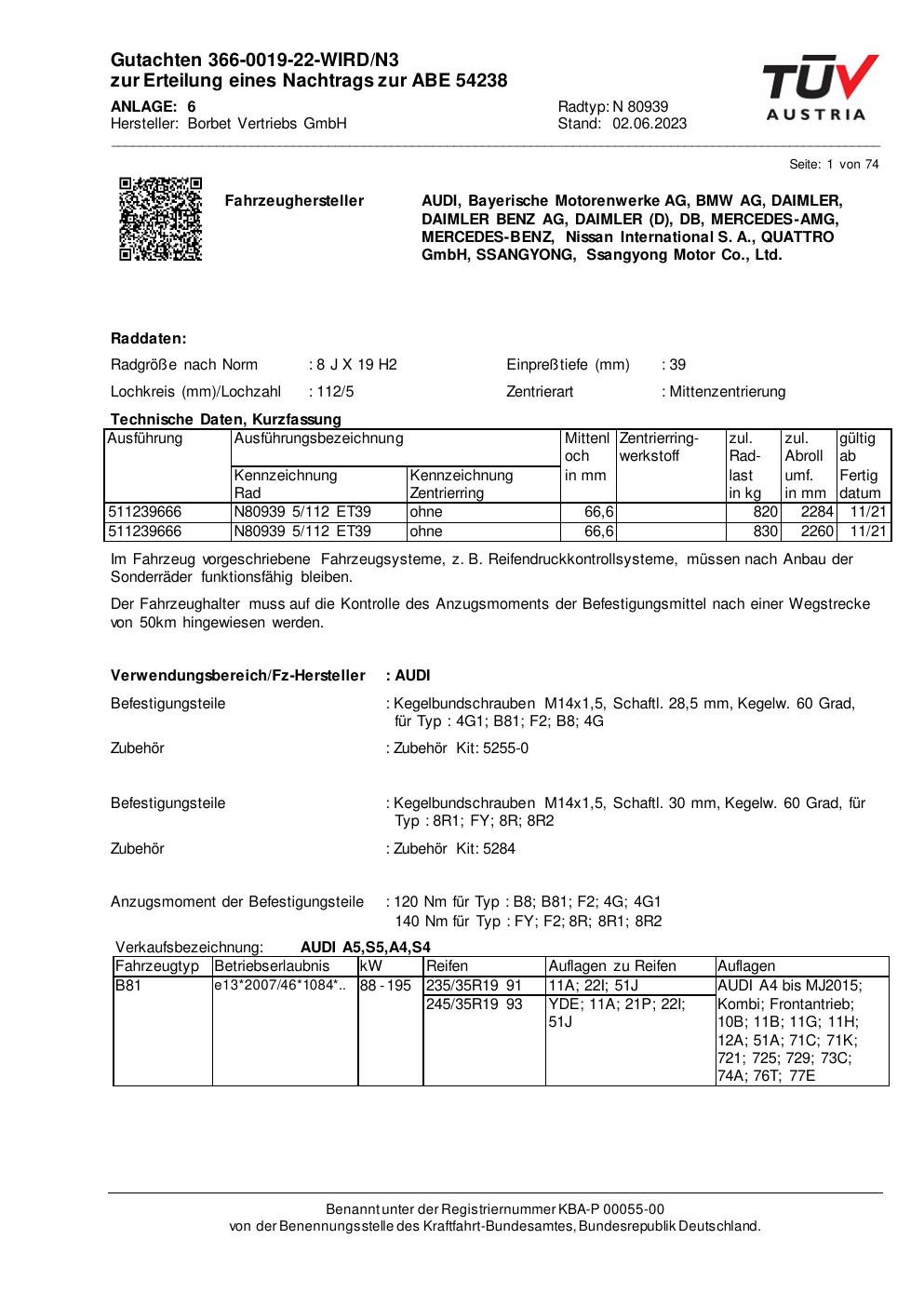 Dieses Gutachten (abe) bezieht sich auf die Alufelge Borbet N 80939 in der Ausführung 8Jx19 ET 0, Mittenloch 0 mm (KBA 54238). Im PDF findest du typischerweise zulässige Reifengrößen, Auflagen/Anbauhinweise und – je nach Dokument – Hinweise zur Eintragung.