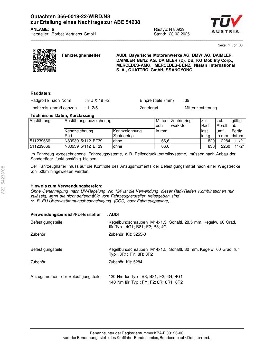 Dieses Gutachten (abe) bezieht sich auf die Alufelge Borbet N 80939 in der Ausführung 8Jx19 ET 0, Mittenloch 0 mm (KBA 54238). Im PDF findest du typischerweise zulässige Reifengrößen, Auflagen/Anbauhinweise und – je nach Dokument – Hinweise zur Eintragung.