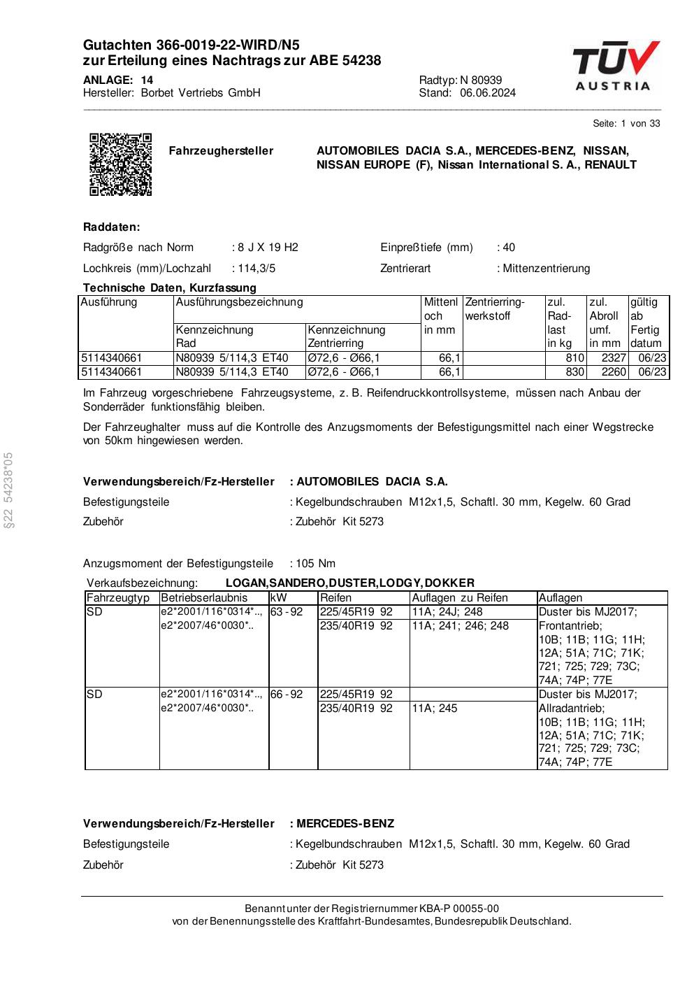 Dieses Gutachten (abe) bezieht sich auf die Alufelge Borbet N 80939 in der Ausführung 8Jx19 ET 0, Mittenloch 0 mm (KBA 54238). Im PDF findest du typischerweise zulässige Reifengrößen, Auflagen/Anbauhinweise und – je nach Dokument – Hinweise zur Eintragung.