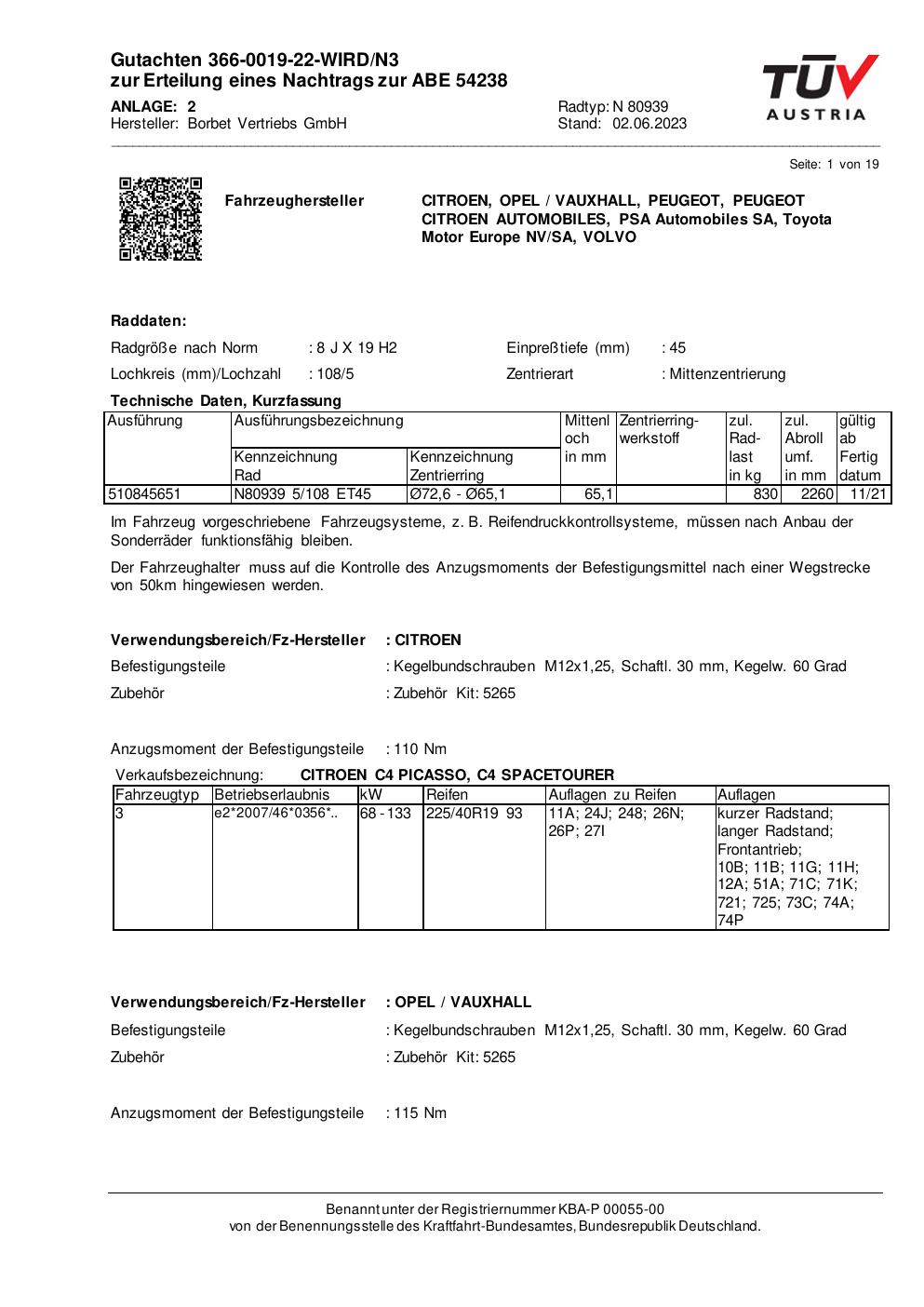Dieses Gutachten (abe) bezieht sich auf die Alufelge Borbet N 80939 in der Ausführung 8Jx19 ET 0, Mittenloch 0 mm (KBA 54238). Im PDF findest du typischerweise zulässige Reifengrößen, Auflagen/Anbauhinweise und – je nach Dokument – Hinweise zur Eintragung.