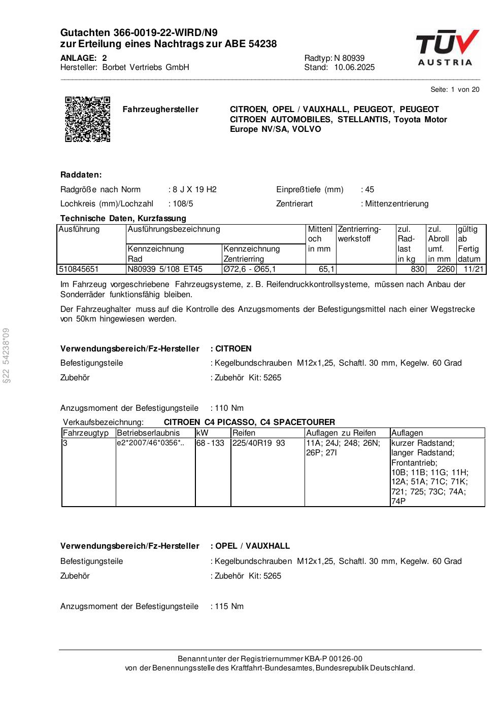 Dieses Gutachten (abe) bezieht sich auf die Alufelge Borbet N 80939 in der Ausführung 8Jx19 ET 0, Mittenloch 0 mm (KBA 54238). Im PDF findest du typischerweise zulässige Reifengrößen, Auflagen/Anbauhinweise und – je nach Dokument – Hinweise zur Eintragung.