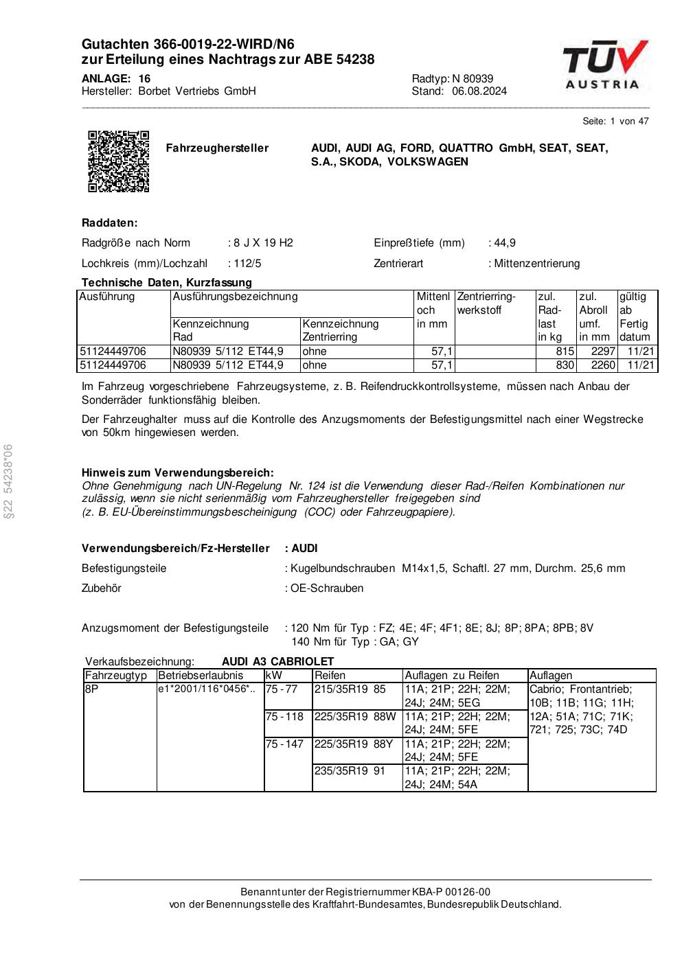 Dieses Gutachten (abe) bezieht sich auf die Alufelge Borbet N 80939 in der Ausführung 8Jx19 ET 0, Mittenloch 0 mm (KBA 54238). Im PDF findest du typischerweise zulässige Reifengrößen, Auflagen/Anbauhinweise und – je nach Dokument – Hinweise zur Eintragung.