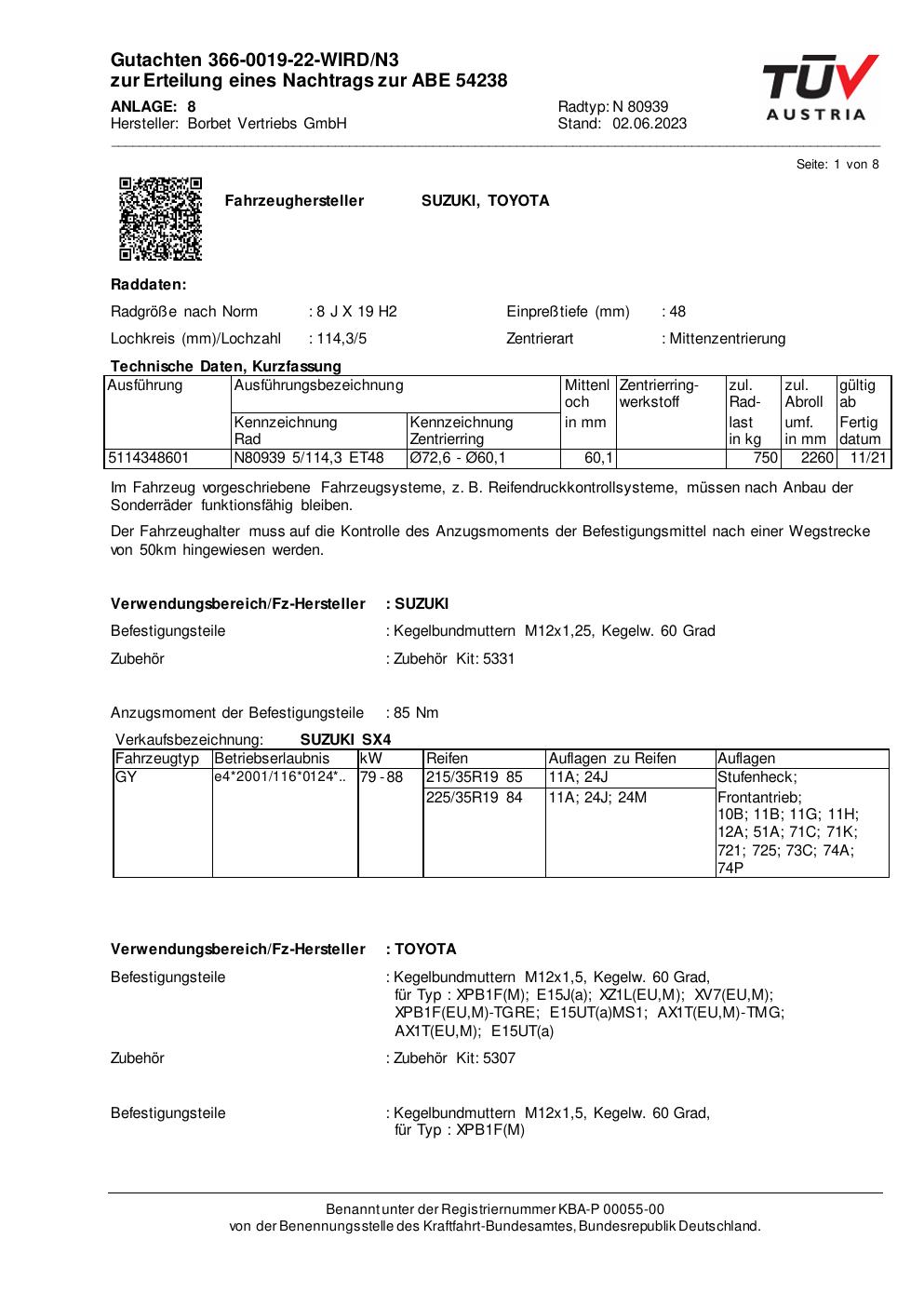 Dieses Gutachten (abe) bezieht sich auf die Alufelge Borbet N 80939 in der Ausführung 8Jx19 ET 0, Mittenloch 0 mm (KBA 54238). Im PDF findest du typischerweise zulässige Reifengrößen, Auflagen/Anbauhinweise und – je nach Dokument – Hinweise zur Eintragung.