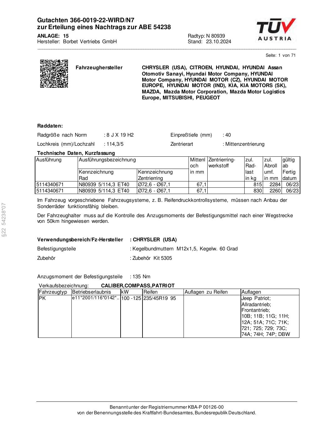 Dieses Gutachten (abe) bezieht sich auf die Alufelge Borbet N 80939 in der Ausführung 8Jx19 ET 0, Mittenloch 0 mm (KBA 54238). Im PDF findest du typischerweise zulässige Reifengrößen, Auflagen/Anbauhinweise und – je nach Dokument – Hinweise zur Eintragung.