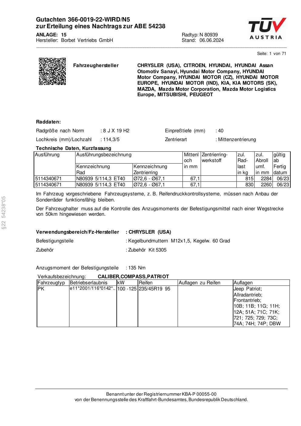 Dieses Gutachten (abe) bezieht sich auf die Alufelge Borbet N 80939 in der Ausführung 8Jx19 ET 0, Mittenloch 0 mm (KBA 54238). Im PDF findest du typischerweise zulässige Reifengrößen, Auflagen/Anbauhinweise und – je nach Dokument – Hinweise zur Eintragung.